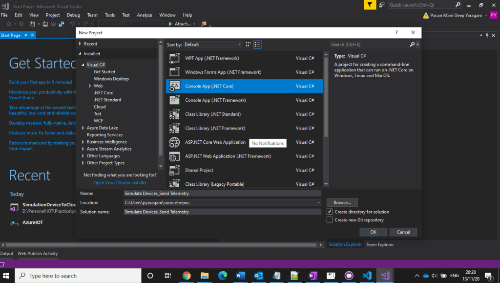 - In Templates, select Visual C#, select Console App (.NET Framework) and give an appropriate name in the ‘Name’ textbox and then click the OK button.