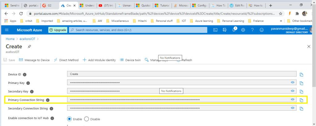 7. Get IoT device connect string from Azure IoT Hub…navigate to Azure Portal –> IOT Hub –> IOT Devices –> Select respective device to be connected.