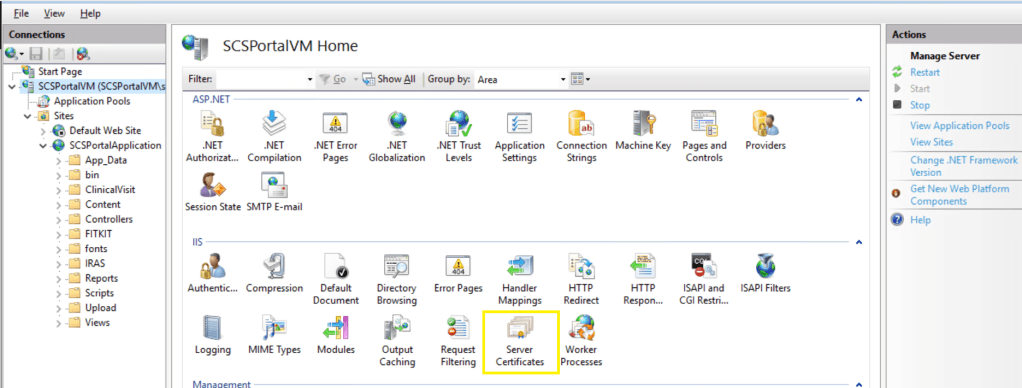For updating certificate, you need use IIS….go to Server Certificates as highlighted below
