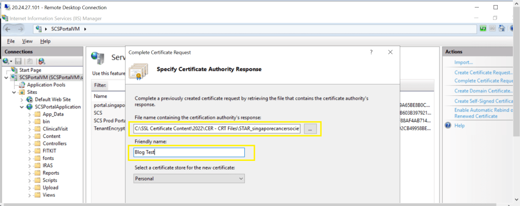 For File name below, click on Elipses and locate the file(.cer) of your SSL certificate provided by certificate issuing authority and click Ok.