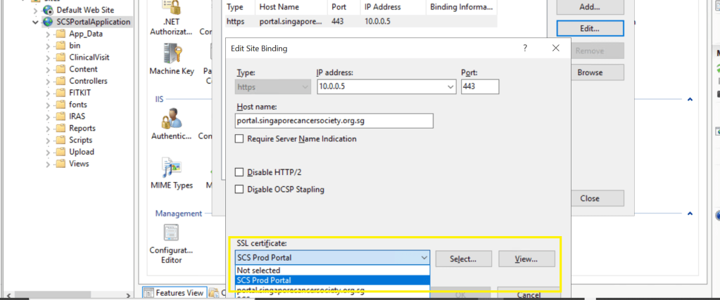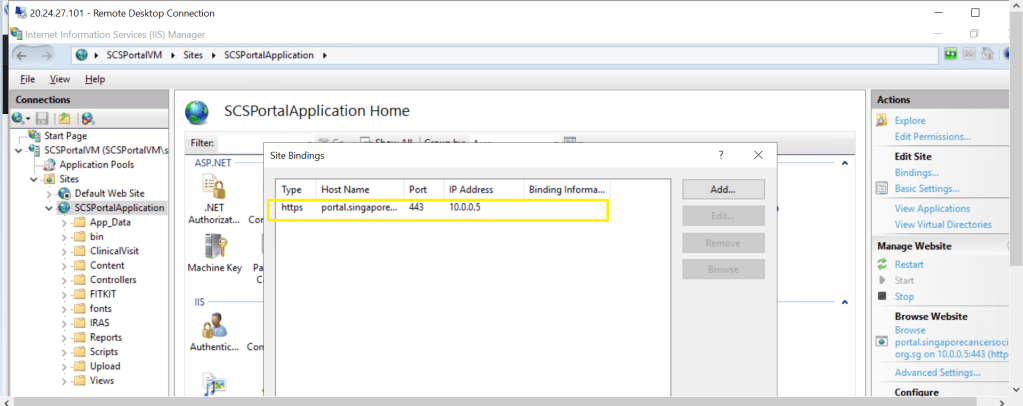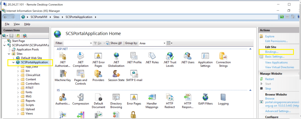 Next step is to update the website bindings to take the latest certificate just updated. Click on your website as below..you should see bindings at the right as highlighted.