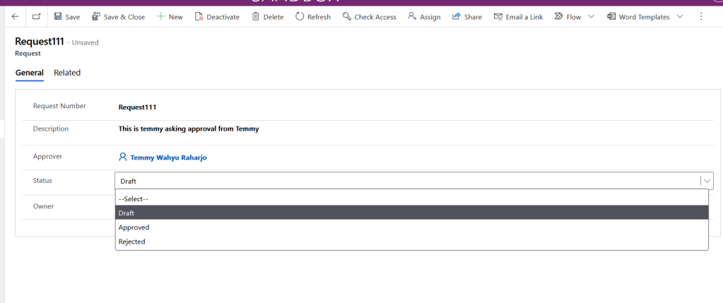 As you can see, the User will fill in the Approver that needs to approve the request. Then in the status field, there are 3 options which are Draft, Approved, or Rejected.