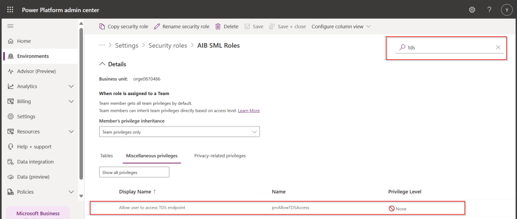 7. Open Security from Power Platform Admin Center and navigate to the available security roles, go to Miscellaneous privileges, search for tds, you can find a privilege to Allow user to access TDS endpoint.