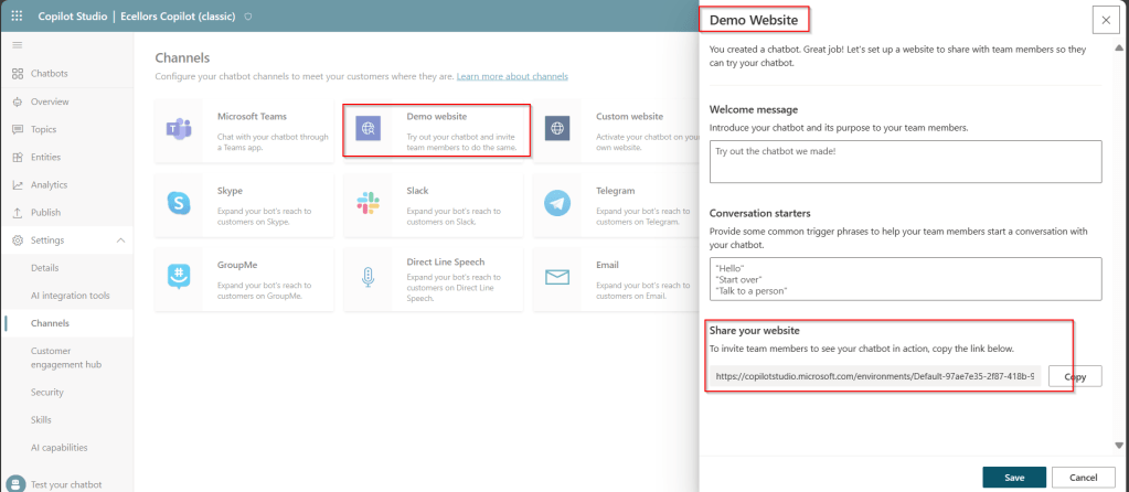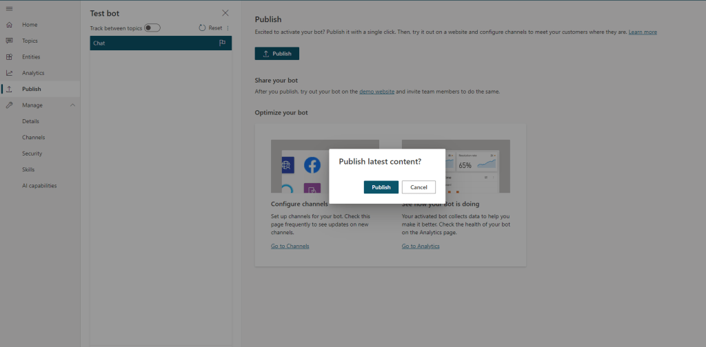 Each time an update is made, you would need to publish the bot in the Copilot Studio and this will publish the changes to all your respective configured channels. If you haven’t configured any channels, you may proceed to next step to get to know this.