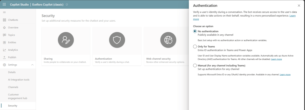 If not enabled, make sure you set the authentication for your Copilot properly for the respective channel to embed your bot. For simplicity, I have chosen No authentication.