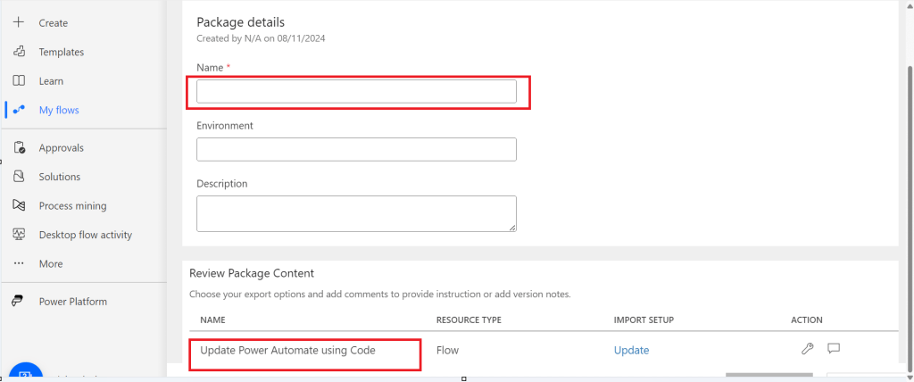 In the next step of export, you will be prompted to key in details as below, just copy the flow name from Review Package Content and paste it in the Name field. Just enter the flow name, it would be enough.