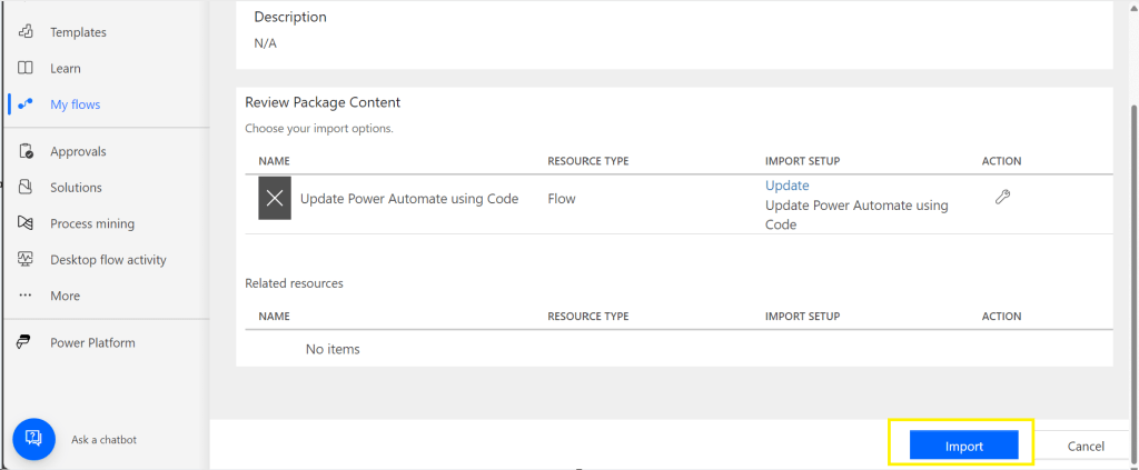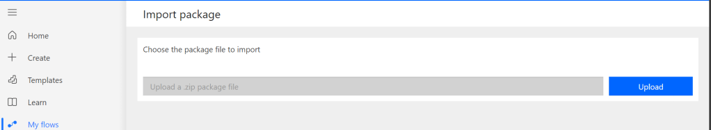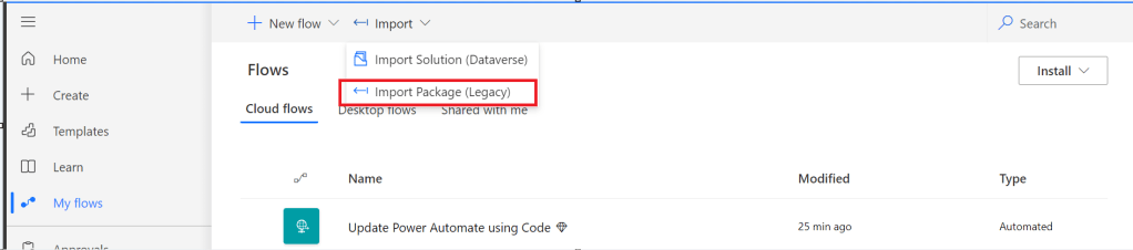 Now navigate to the https://make.powerautomate.com, click on import option available and choose Import Package (Legacy)