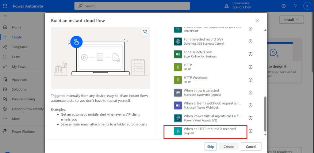Navigate to https://make.powerautomate.com and create an instant Cloud Flow
