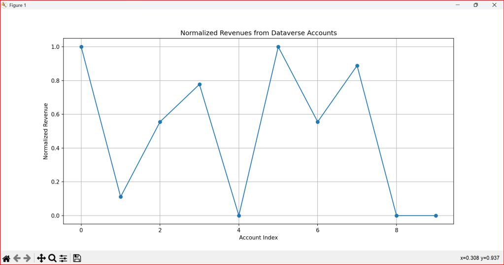 import matplotlib.pyplot as plt plt.plot(normalized_revenues, marker='o')plt.title('Normalized Revenues from Dataverse Accounts')plt.xlabel('Account Index')plt.ylabel('Normalized Revenue')plt.grid()plt.show()