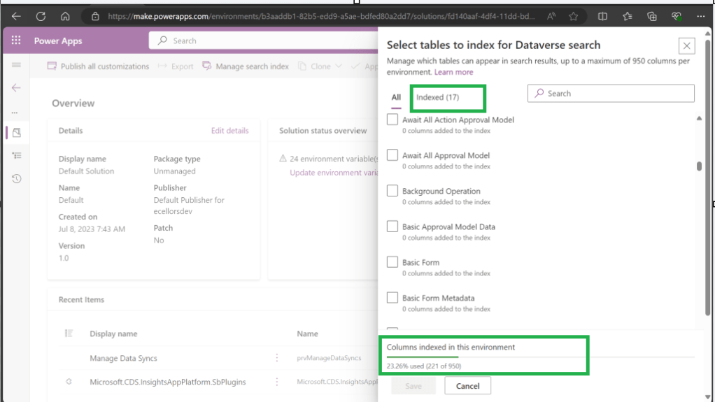 Once enabled, we need to configure the tables for Dataverse Search so that indexing is performed at the backend, in order to do this…