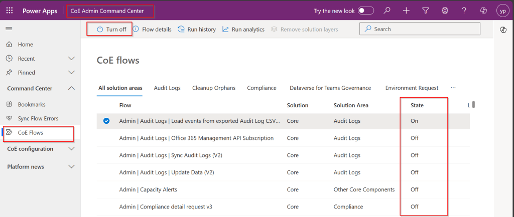 The Compliance page in the CoE Starter Kit’s Compliance and adoption dashboard can help you identify apps and flows with no owners, noncompliant apps, and suspended flows.