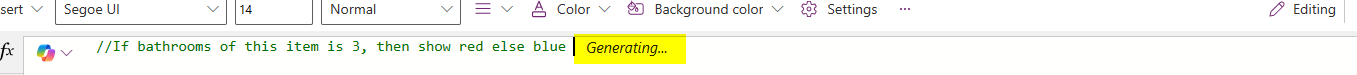 Now you can generate Power Fx using Copilot, you can start typing in natural language what you need in comments and as soon you stop typing, it shows as generating as below…you could use either // and /* */, comments can remain in the formula bar as documentation, just like with traditional code.