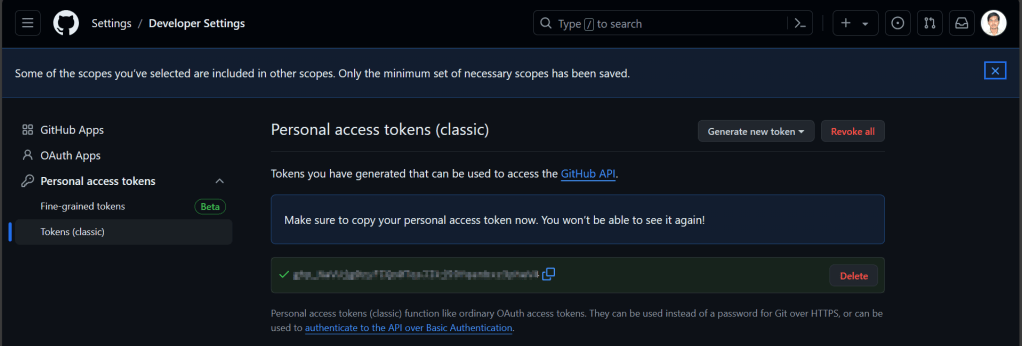 Copy the personal access token in the connect to a Git Repository window, once authenticated, you should see a message like below.