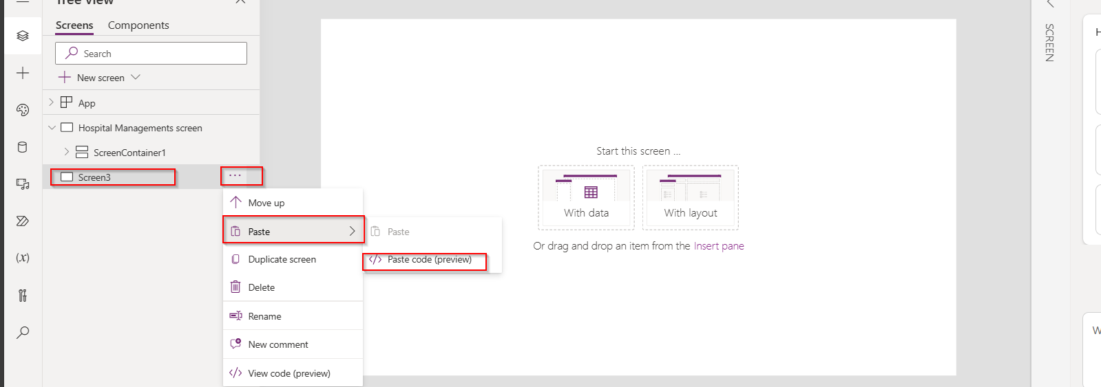 Once blank screen is added, expand it so that it occupies the entire size of the App, then click on Paste as below