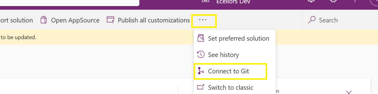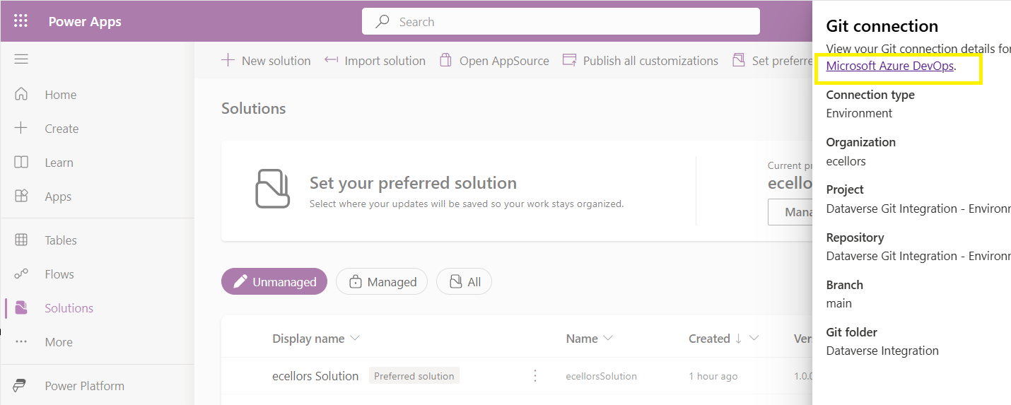 Now let’s verify our Azure DevOps Repo..for this you can go back to the main solutions page, click on Git Connection at the top..