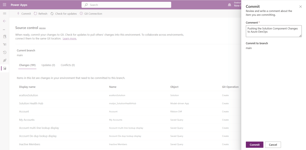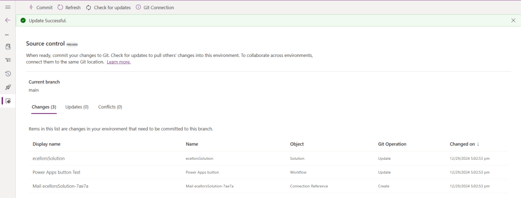 If you did some changes at the Azure DevOps repo level, you can come back and click on Check for updates, if there were any conflicts between changes done in Azure DevOps and component in solution, it will be shown as conflict.