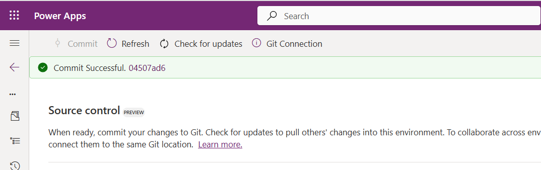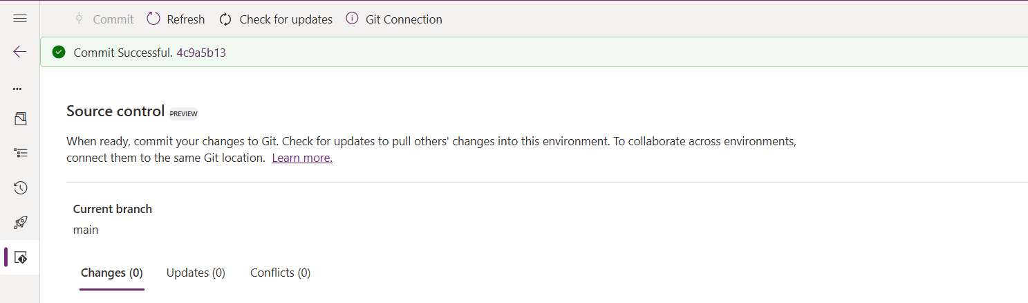 While it takes few minutes unlike pushing the code to Azure DevOps to push the changes, however this would depend based on the number of solution components you were pushing..once it is done, it will show a commit message like below…